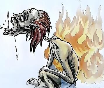饿鬼道的苦言说不尽!我在饿鬼中属于福报贫瘠最底层的那种,样貌骇人,头小眼凸,鼻凹嘴大,四肢畸形短小,肚大如瓮,喉咙却只有针尖细。口中腹部还常有火烧!